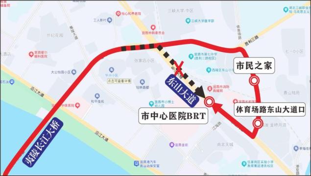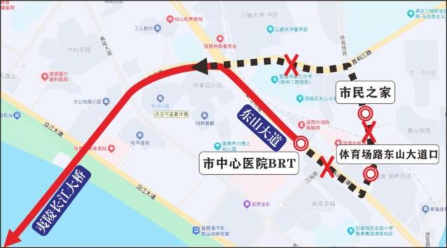 上行:线路由市中心医院BRT出发,经东山大道、夷陵长江大桥恢复原线运行。取消市民之家、体育场路东山大道口2个站点。