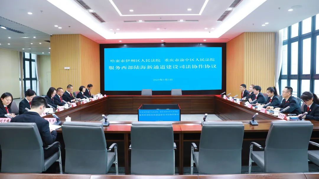 随后,渝中法院党组副书记、副院长朱晓代表渝中法院与哈密伊州法院签订《服务西部陆海新通道建设司法协作协议》,该协议以重庆高院牵头建立的《服务西部陆海新通道建设司法协作“13+2”协议》和《重庆市渝中区人民政府·哈密市人民政府战略合作协议》为蓝本,内容涵盖推动重大战略实施、加强审判事务协作、促进法律适用统一、健全工作保障机制4个领域15项内容,在找准各自司法服务重点的基础上,积极探索高水平区域司法协作新样态,开启了两地跨区域司法协作的新篇章。