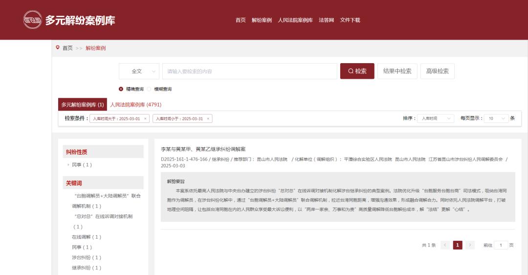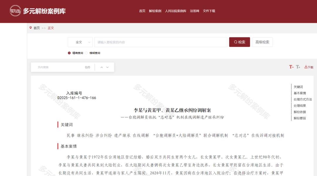 近日,昆山市人民法院报送的《李某与黄某甲、黄某乙继承纠纷调解案——台胞调解员依托“总对总”机制在线调解遗产继承纠纷》案例入选最高人民法院多元解纷案例库,系我院第三篇入库案例。