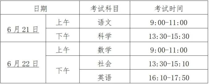 语文120分、数学120分、英语120分(含听力考试20分)、科学160分、社会(含道德与法治、历史与社会,下同)100分、体育40分,总分660分。语文、数学、英语、科学、社会等5门科目由省级统一命题,统一时间考试。今年浙江中考安排在6月21日—22日,比去年整体提前1天。具体安排如下: