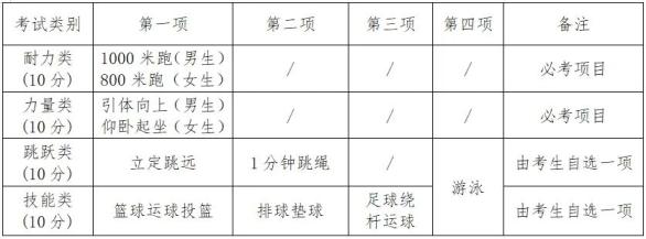 2025年体育考试项目分四类:耐力类、力量类、跳跃类、技能类,共八项(总分40分),100米游泳项目可替代跳跃类、技能类中的其中一项,但只能替代一次。耐力类考试项目为男生1000米、女生800米;力量类考试项目为男生引体向上、女生仰卧起坐;跳跃类考试项目为立定跳远、1分钟跳绳,由考生自选其中一项;技能类考试项目为篮球运球投篮、排球垫球、足球绕杆运球,由考生自选其中一项。(具体见下表)