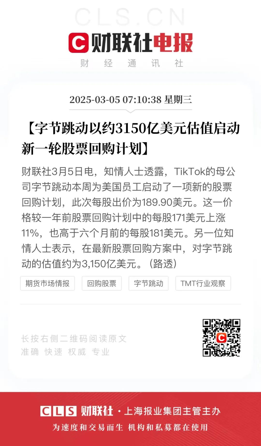 知情人士透露,TikTok的母公司字节跳动本周为美国员工启动了一项新的股票回购计划,此次每股出价为189.90美元。这一价格较一年前股票回购计划中的每股171美元上涨11%,也高于六个月前的每股181美元。另一位知情人士表示,在最新股票回购方案中,对字节跳动的估值约为3,150亿美元。