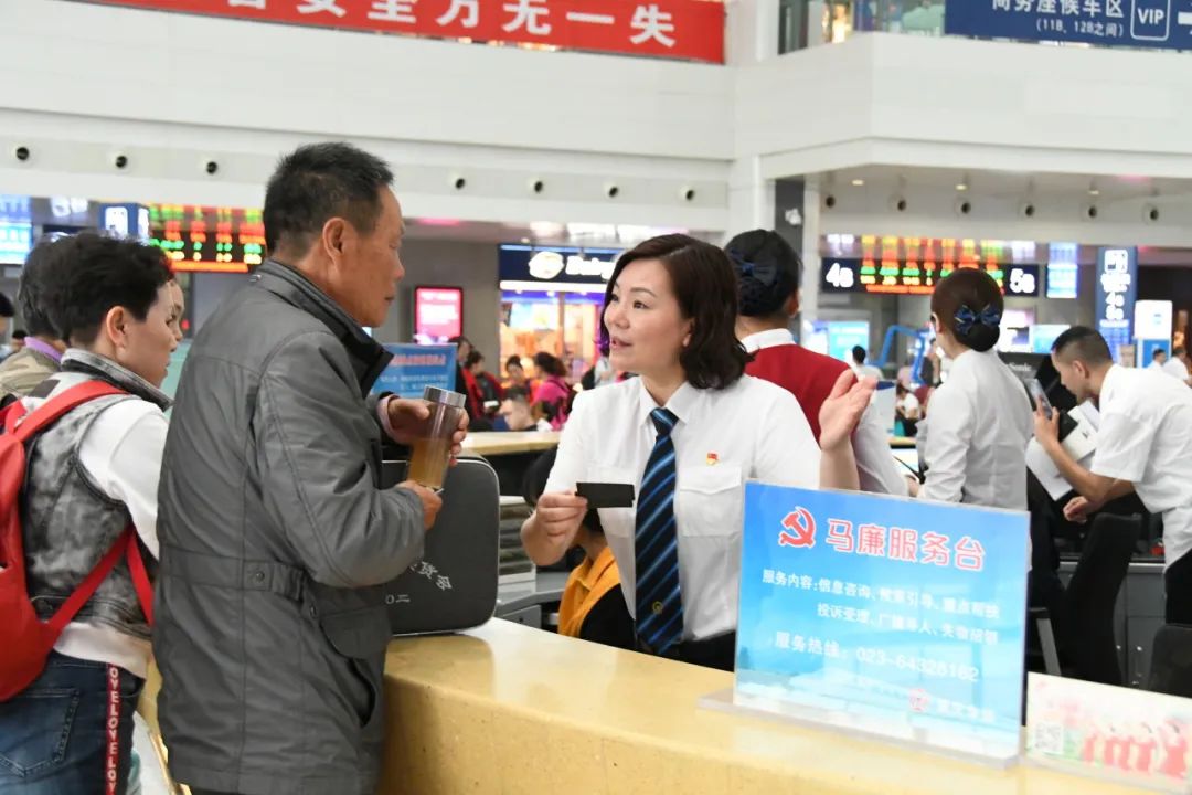 重庆西站“红岩服务站”于2020年1月成立,集列车信息查询、重点旅客服务、失物招领、车票改签、投诉受理、快速导购等功能为一体,配备轮椅、拐杖、担架、针线包、应急药品等服务器具。
