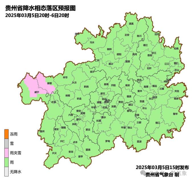 03月04日08时至03月05日08时,大雨出现在黔东南州的镇远、黎平2县域内的4个观测站(乡镇最大为镇远县蕉溪31.1毫米),中雨有165个观测站,小雨有2397个观测站;铜仁市的万山最低气温在0℃及以下(-1.2℃)。