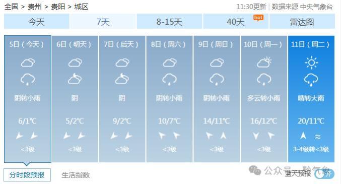 贵阳天气预报今天夜间到7日白天,阴天有小雨;