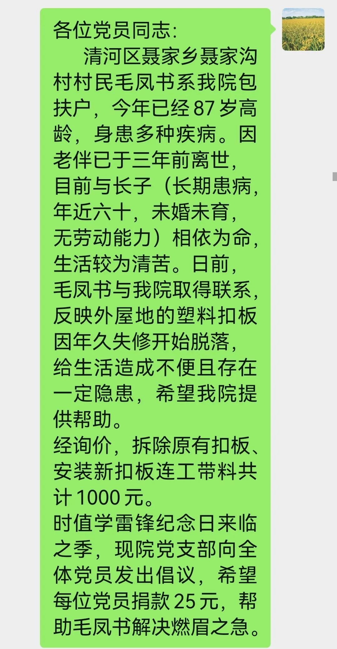 适逢第62个学雷锋纪念日、第26个中国青年志愿者服务日来临之际,为践行党员宗旨、凸显党员担当,清河区人民法院党支部向全体党员发出了捐款倡议。面对老人的现实困境和迫切需求,党员们深受触动,纷纷慷慨解囊。在谢绝老党员们“出全资”“拿大头”的提议后,由全院40名中共党员均摊了本次修葺的全部费用,让善举更有意义,帮助更有温度。