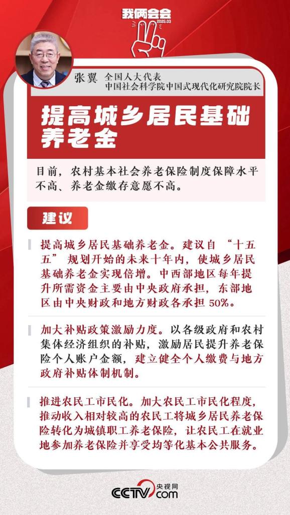 对此,全国人大代表、中国社会科学院中国式现代化研究院院长张翼建议,自“十五五”规划开始的未来十年内,使城乡居民基础养老金实现倍增。他进一步表示,应加大补贴政策的激励力度,推进建立健全个人缴费与地方政府补贴的体制机制。同时推进农民工市民化,包括推进让农民工在就业地参加养老保险并享受均等化基本公共服务等措施。