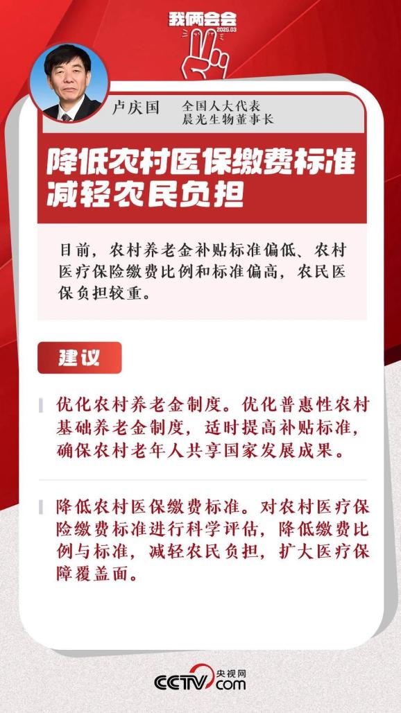 全国人大代表、晨光生物董事长卢庆国也建议,优化普惠性农村基础养老金制度,适时提高补贴标准,对农村医疗保险缴费标准进行科学评估,降低缴费比例与标准,扩大医疗保障覆盖面,减轻农民负担,确保农村老年人共享国家发展成果。