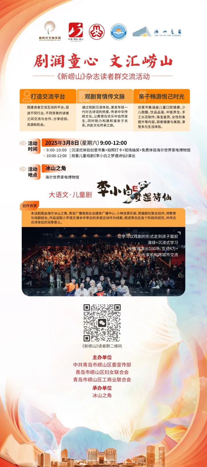 3月8日(周六)上午,由崂山区委宣传部、崂山区妇联、崂山区工商联主办的“剧润童心 文汇崂山”宣讲活动,将在青岛冰山之角(海尔世界家电博物馆)启幕。活动旨在搭建多元化交流平台,观剧育情传文脉,亲子畅游悦己时光,同时也为《新崂山》杂志读者群带来专属的精彩体验。