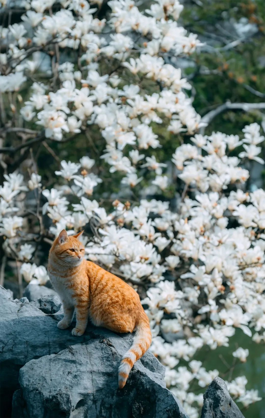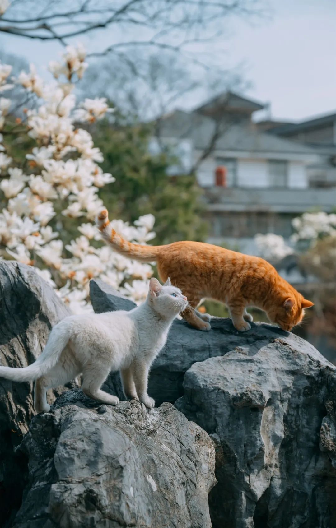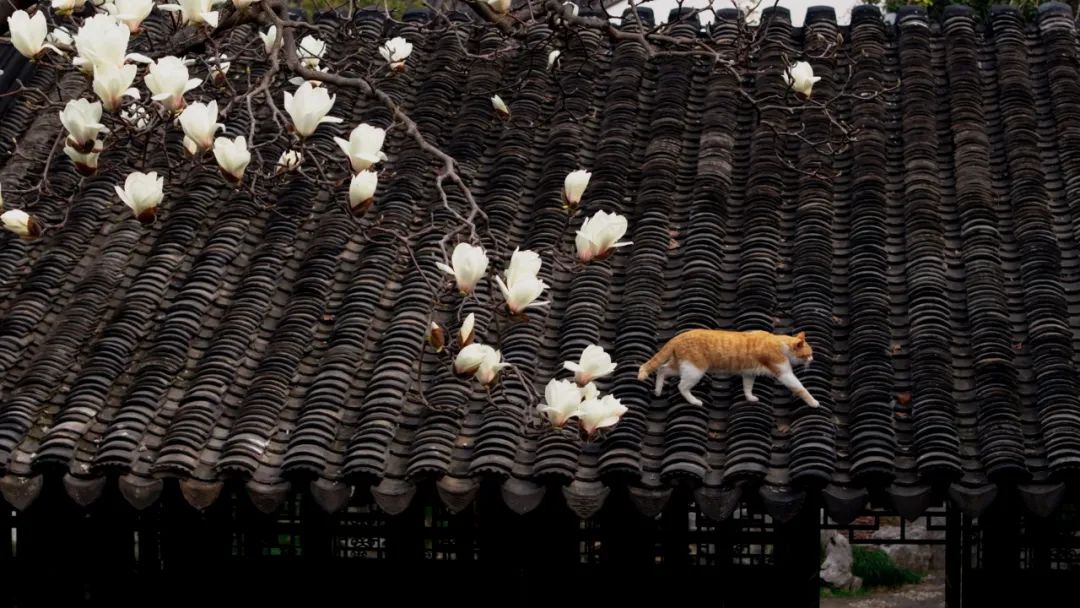 还能拍到猫咪在玉兰树下玩耍