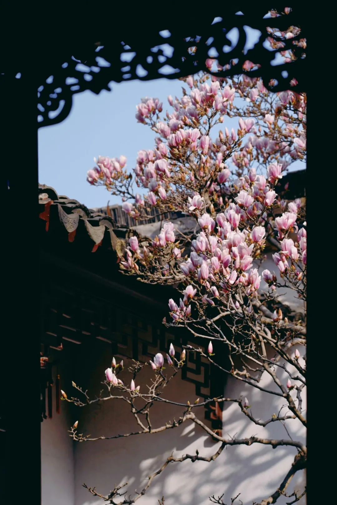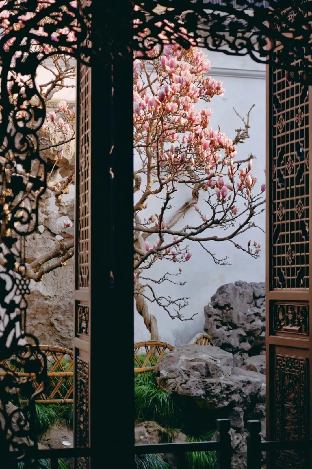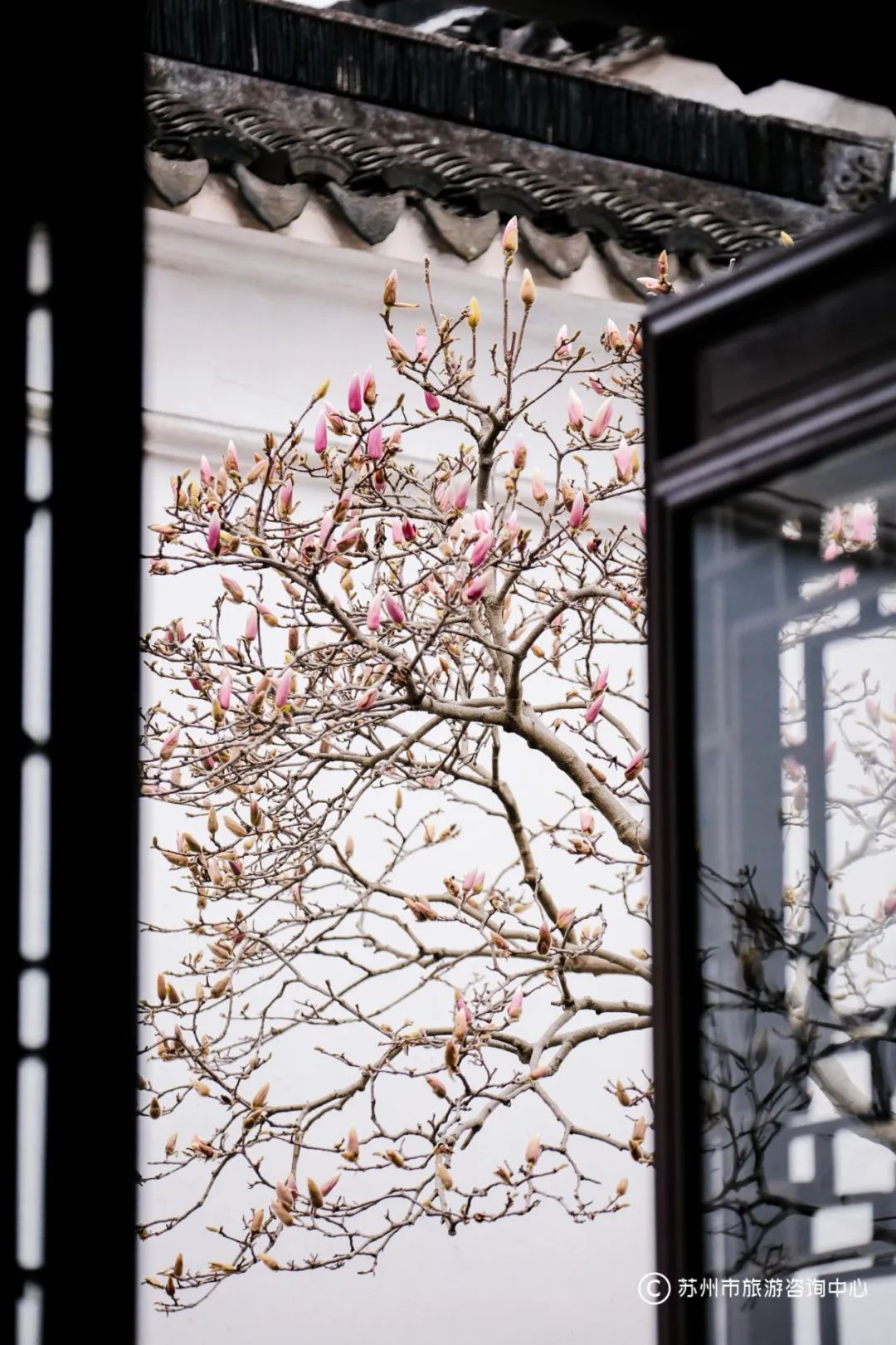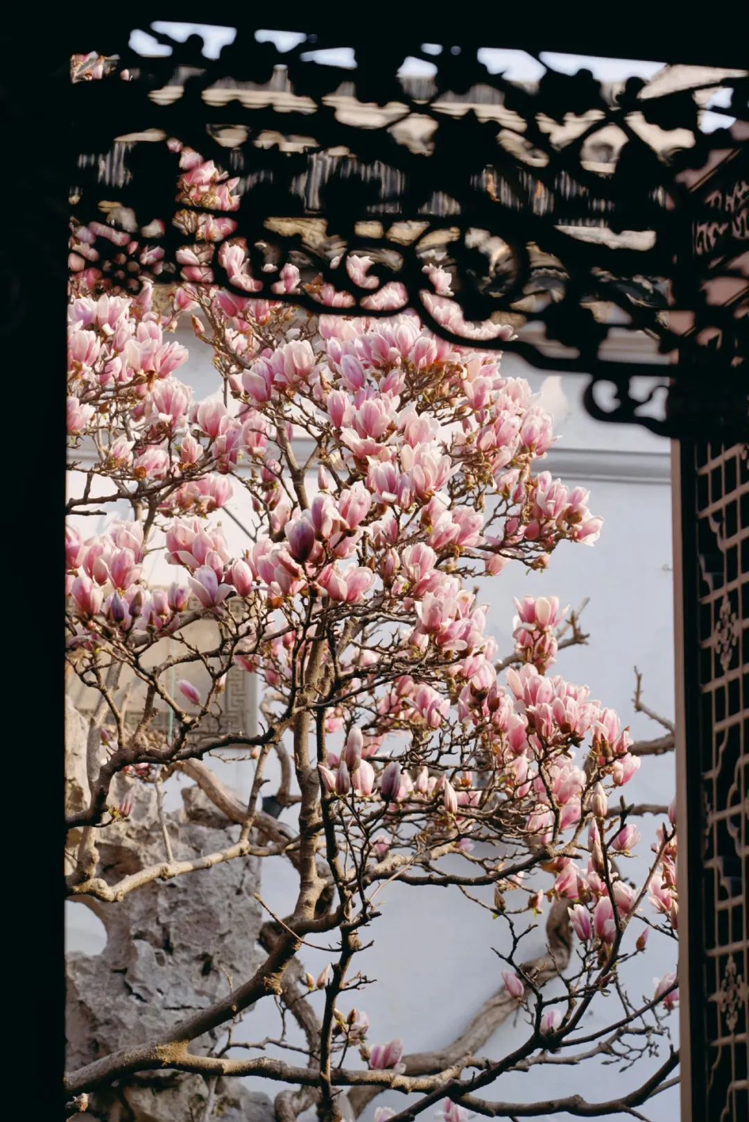 透过园内的花窗赏玉兰