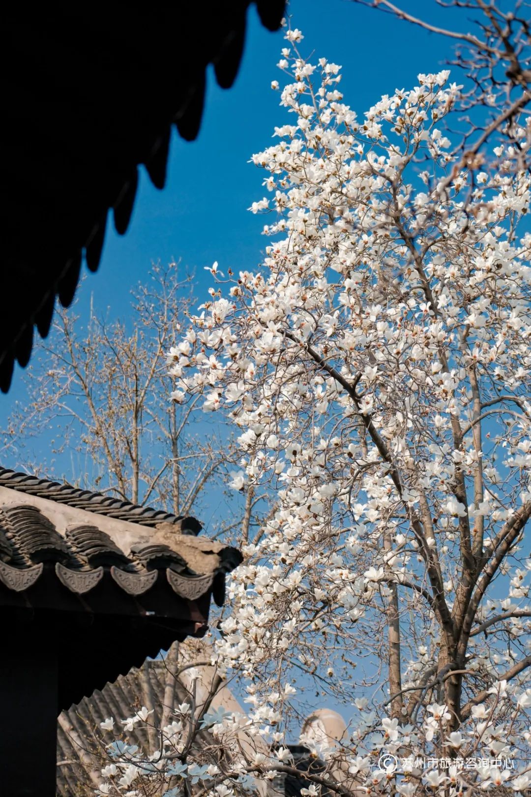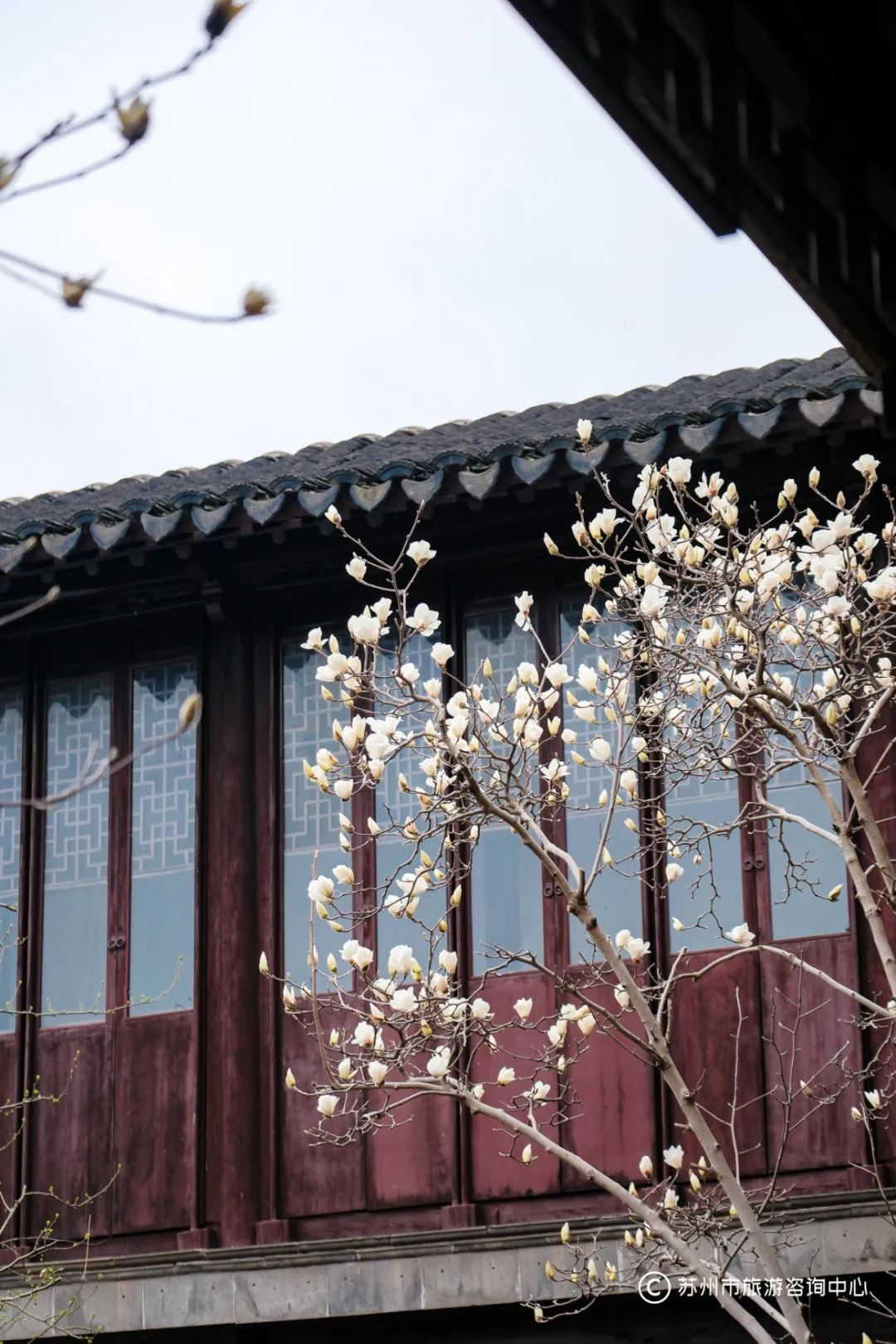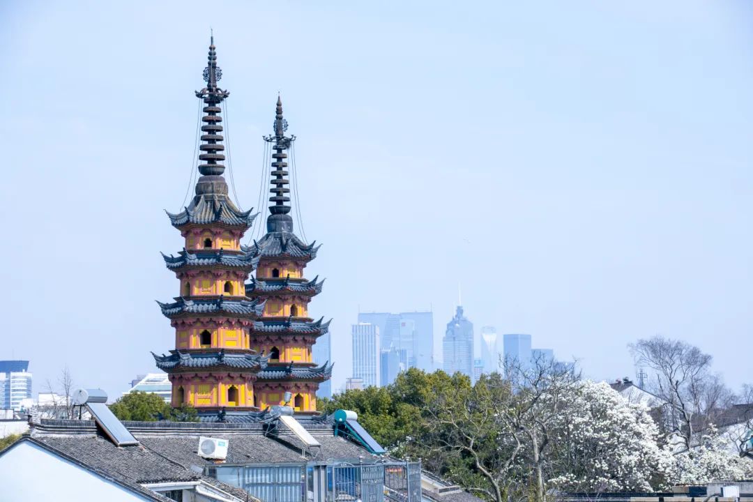 温馨提示:在苏州市旅游咨询中心凤凰街中心站三楼,你可以拍到双塔、玉兰与远处东方之门同框的画面哦。