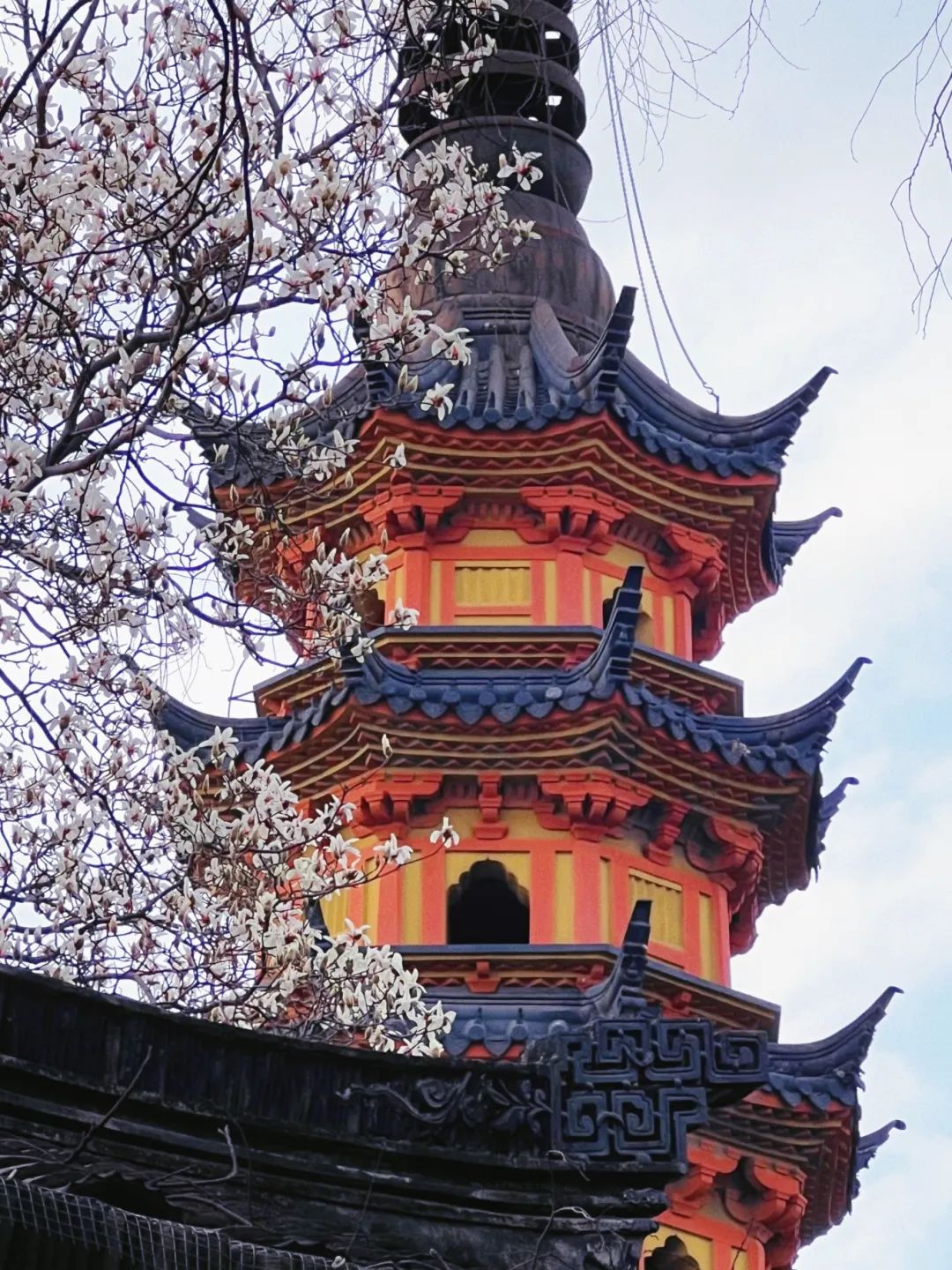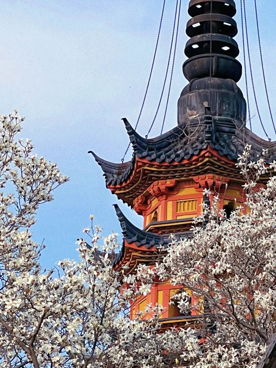 满树的洁白玉兰花映衬着千年宋塔