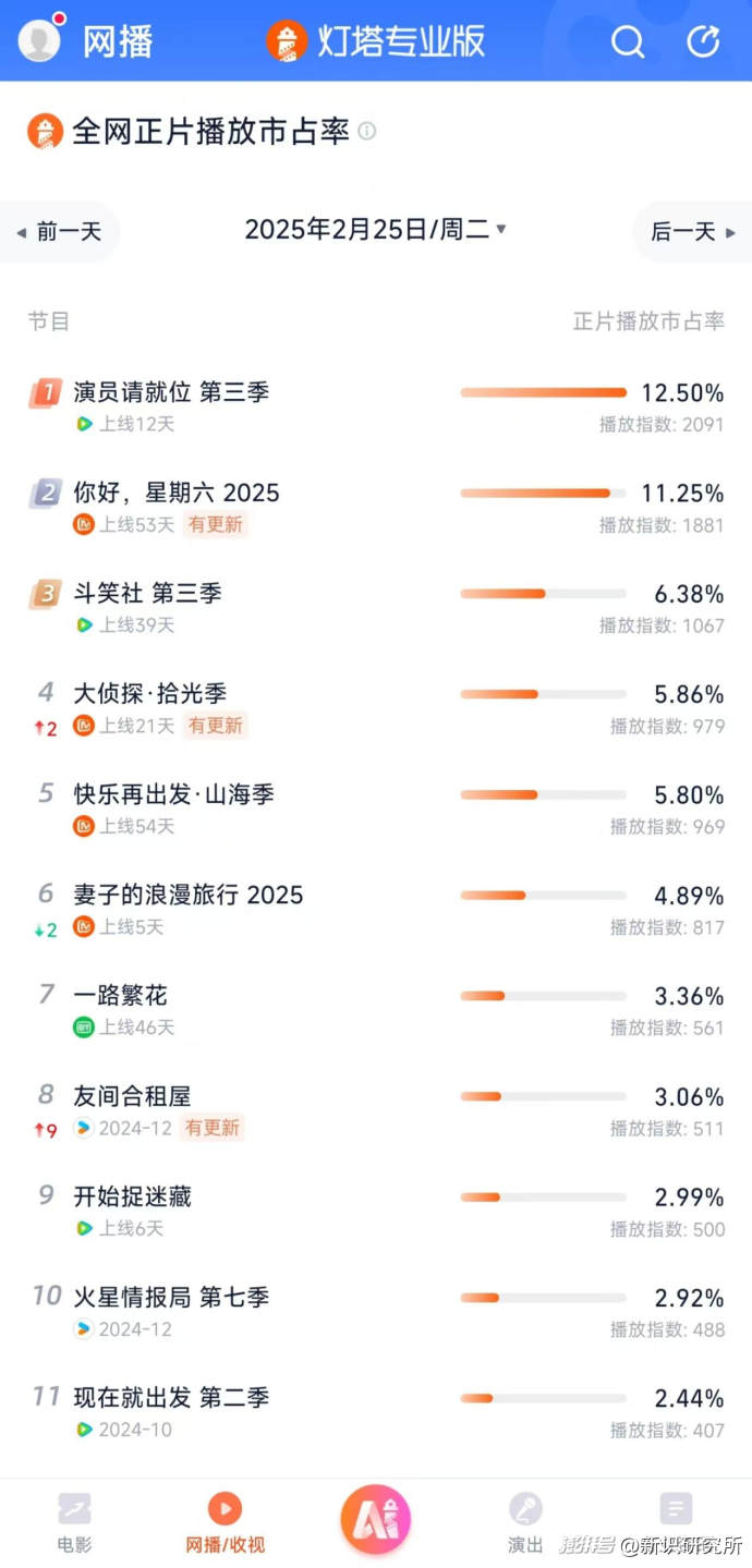 灯塔专业版显示,截至2月25日,上线五天的《演员请就位3》实时正片播放市占率以12.5%超过《你好,星期六2025》《声生不息·大湾区季》等,位列综艺板块第一。