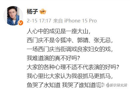 杨子还在微博喊冤:“人心中的成见是一座大山,西门庆当街调戏良家妇女的戏,我难道演得真不好吗?大家的各种心理不适不代表演得好吗”?