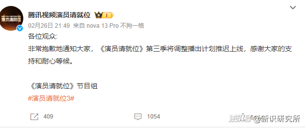 播出两期被紧急叫停,腾讯视频的《演员请就位3》节目组就发文称将推迟上线,具体推迟原因并未说明。
