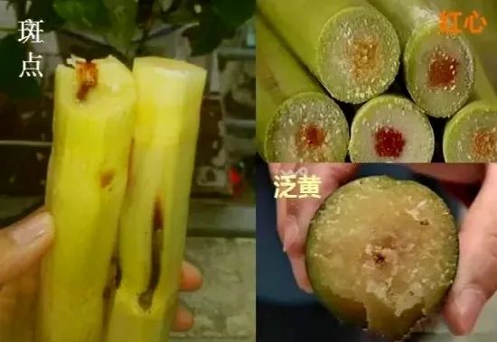所以我们在买甘蔗时,如果甘蔗闻起来有股酸味、霉味或者酒糟味;摸起来质地比较软;甘蔗色泽比较差、末端出现絮状或绒毛状白色物质,切开后剖面上有泛红黄色、棕褐色、青黑色的斑块斑点等等,一定要慎重。