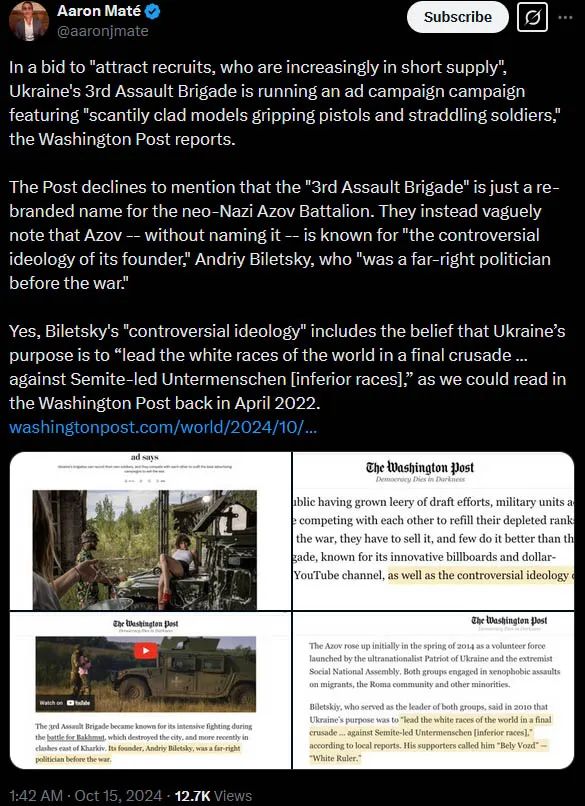 《华盛顿邮报》曾报道第3突击旅拍摄美女广告,但X用户批评其报道回避了该旅的新纳粹主义问题,甚至不敢提“亚速营”的名字 X平台得益于捐款支持,这些部队拥有充足的资金,并因其精心策划的社交媒体形象而广为人知。他们的YouTube频道播放着前线的第一人称战斗视频,吸引了数百万乌克兰观众观看。