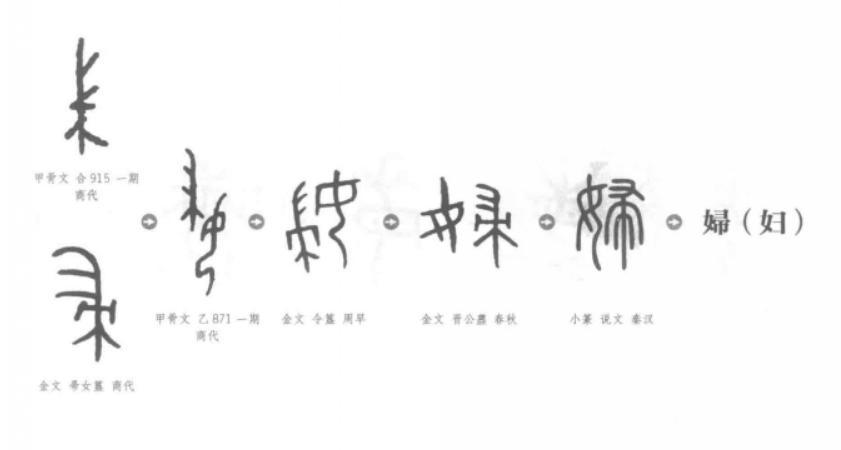 有学者认为,这是个男子打猎、女子务农的时代,因此甲骨文和金文中的“婦”,似一个女子在插秧。“女”旁边的“帚”,不是扫帚,而是扎根地里、穗歪一旁的稻禾。
