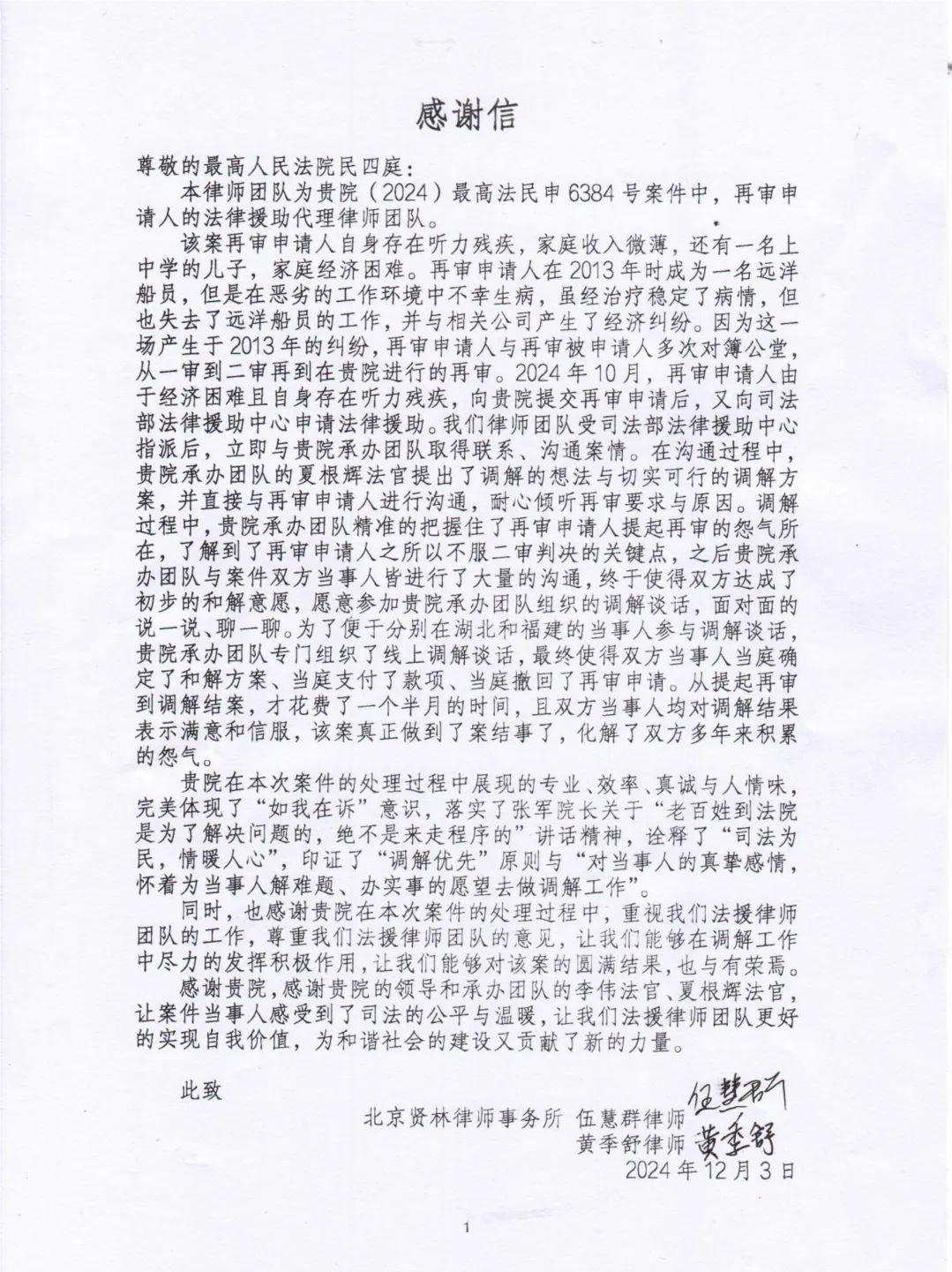 2024年盛夏的一天,最高人民法院院长张军收到了来自双方当事人的两封感谢信。