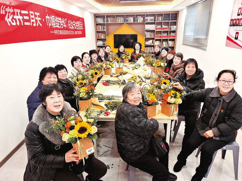 社区妇女同胞一起插花。记者 肖雄 摄