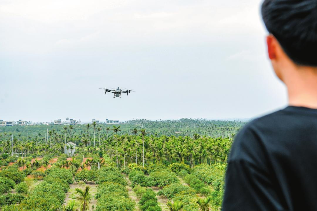 近日,在琼山区三门坡镇的火山荔枝种植基地,果农正使用无人机进行疏花控花。苏弼坤 摄