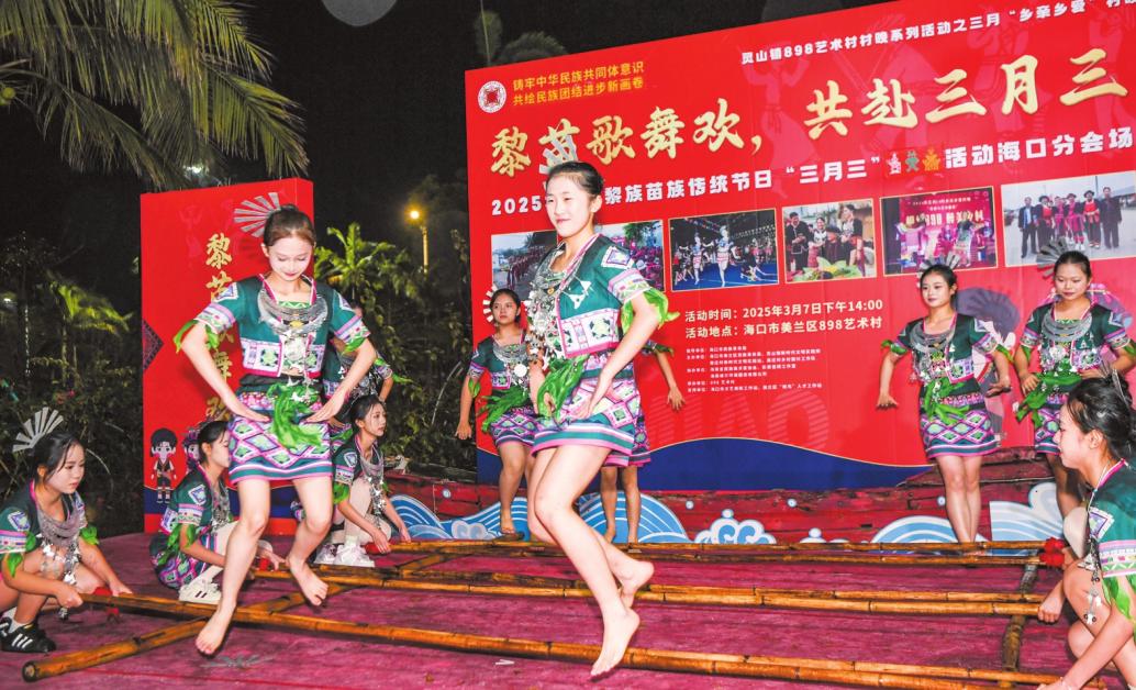 3月7日晚,2025年海南黎族苗族传统节日“三月三”节庆活动海口分会场在美兰区898艺术村举行。来自广西瑶族、海南黎族和苗族的500余名同胞齐聚一堂,通过长桌宴、文艺晚会等形式,共同体验了一场民族文化与艺术交流的盛宴。