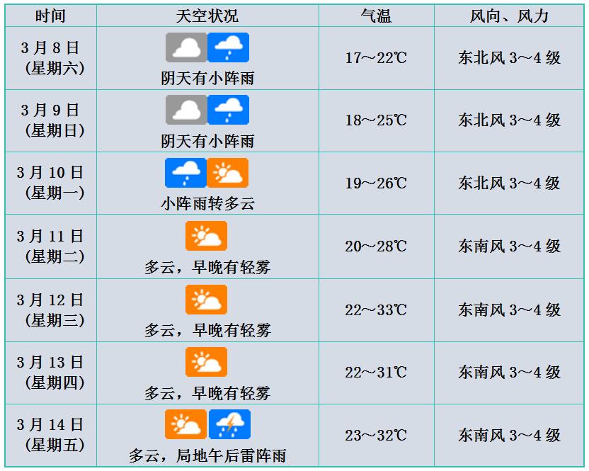 据海口市气象台消息,预计海口未来一周前期多阵雨,中后期多云为主。3月9日至10日,受冷空气影响,海口阴天有小阵雨。3月11日至14日,多云天气为主,局地午后有雷阵雨,气温将逐日平缓上升。11日至14日,预计琼州海峡早晚有轻雾或雾。