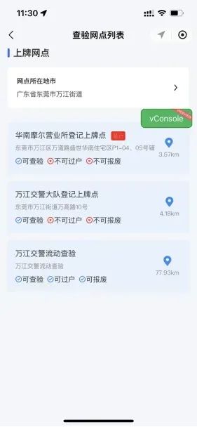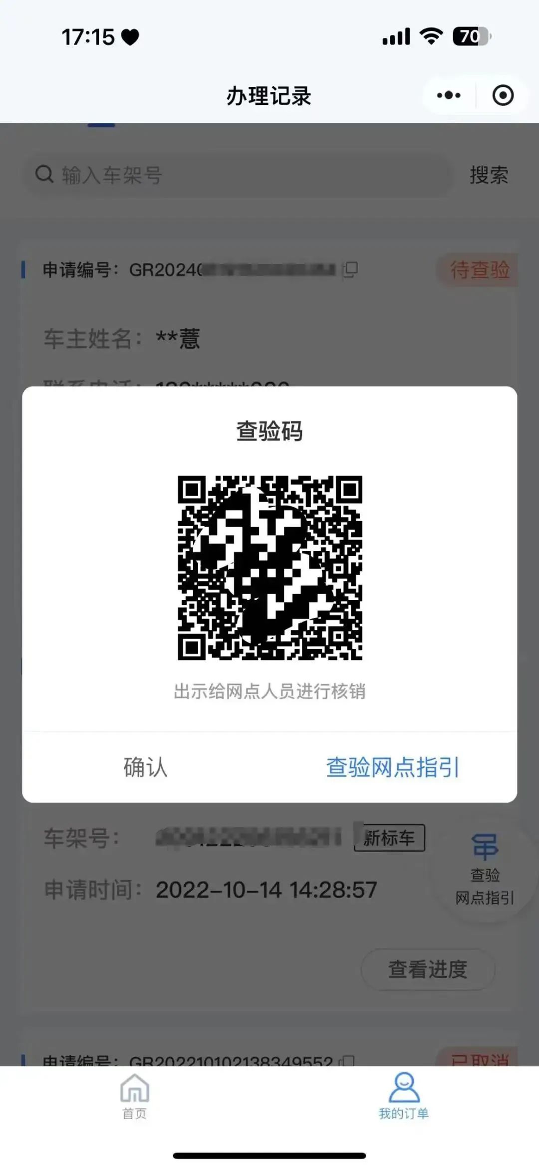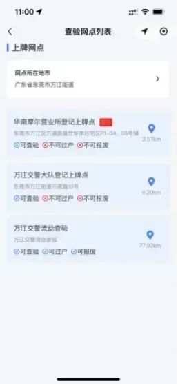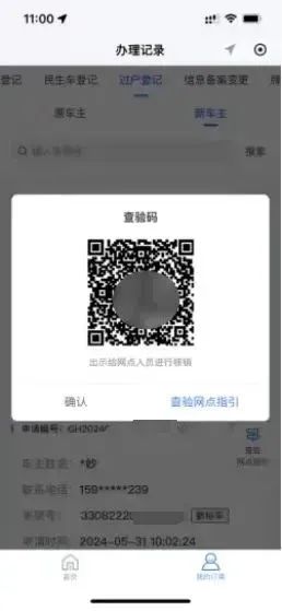 选择"我的订单",点击"出示查验码"可查询就近登记上牌点。新、旧车主携带身份证明、转让证明、行驶证到登记上牌点交验车辆。
