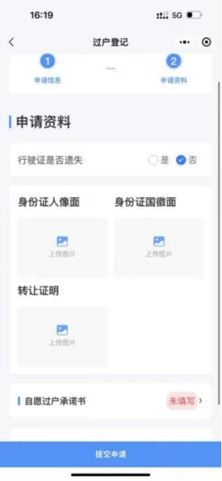 2、旧车主行驶证如果遗失,请在系统上勾选"是"(如行驶证已遗失,需填写遗失声明);如未遗失,则勾选"否",后续上传旧车主身份证明、转让证明图片并浏览含旧车主信息的变更登记申请表,确认无误后签名,完成申请。
