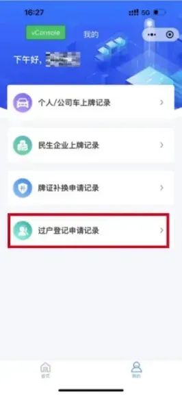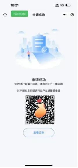3、旧车主提交业务申请后,可打开系统的个人页面,选择"过户申请记录",旧车主点击"出示接受码",新车主扫码后跳转到"东莞电动自行车"微信小程序。