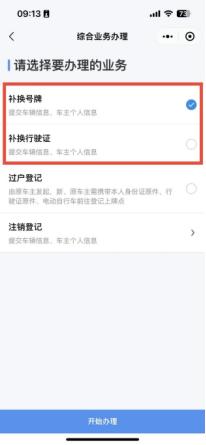 点击“电动自行车综合业务办理登记”,选择“补换号牌”或“补换行驶证”业务,点击最下方蓝色一栏的“开始办理”按钮,进行实名认证,拍摄车辆左前方45度的照片(如系统缺失)并上传,填写个人和车辆信息后,在《电动自行车补换牌证申请表》签名确认。