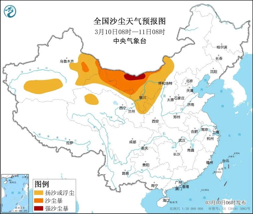 预计,3月10日08时至11日08时,新疆东部和南部、内蒙古中西部、甘肃西部、宁夏、青海西北部、陕西北部等地有扬沙或浮尘天气,其中新疆东部、内蒙古西部、甘肃西部等地的部分地区有沙尘暴,局地有强沙尘暴。