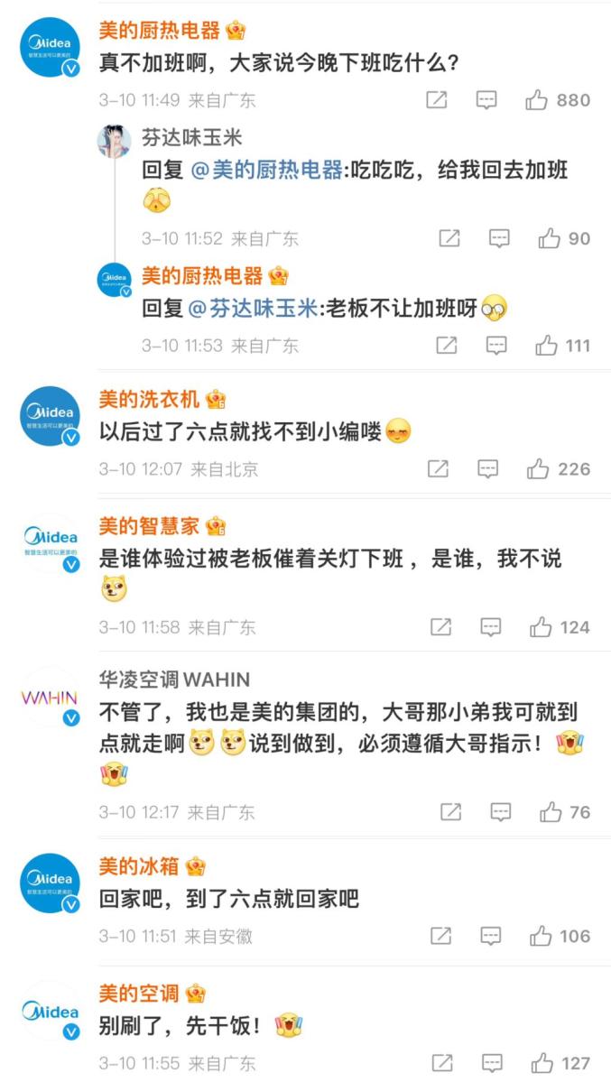 与此同时,微博热搜下多个美的官方账号也回应称“被老板催着关灯下班”、“到了六点就回家”。
