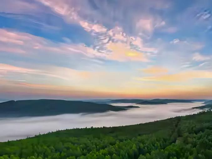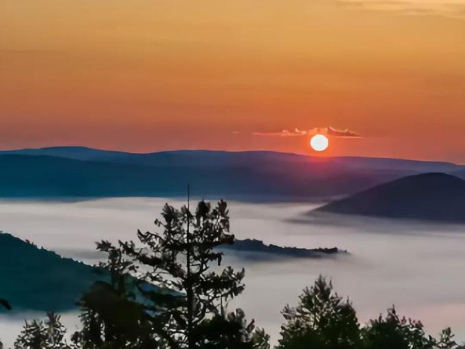 日出云海。(摄影/李明)在内蒙古,有奇特的云海与地貌互动景观:呼伦贝尔市柴河镇(月亮小镇)吉尔果天池云海在山峦间流淌,低垂的云层与大兴安岭原始森林、火山地貌交相辉映;根河市奥克里堆山(鲜卑山)冬季积雪覆盖,日出时分云雾与朝霞交融,云海如金色波涛漫卷山峦,形成“万壑争辉”的壮丽图景;锡林郭勒草原与云海共生,日出日落时霞光与云层交映,被形容为“淡雅动感的“中国画”。特殊气象下,还会偶现“云中云”奇观,如鱼鳞云中的圆形空洞包裹心形云层,被网友称为“龙眼云”。