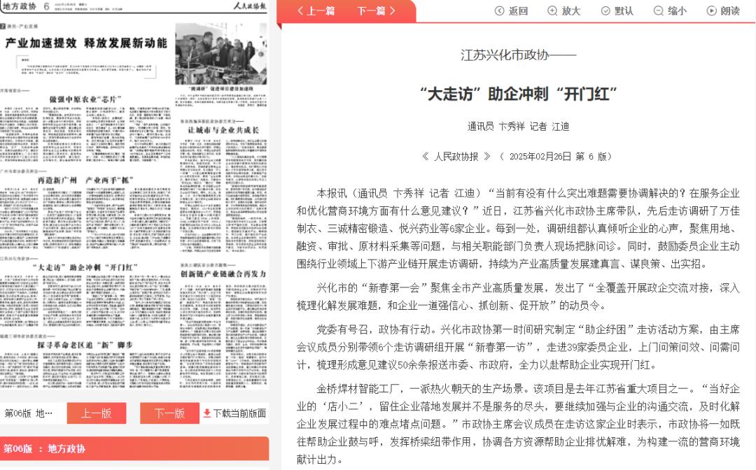 《人民政协报》推出《江苏兴化市政协——“大走访”助企冲刺“开门红”》