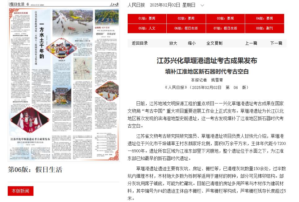 《人民日报》报道《江苏兴化草堰港遗址考古成果发布 填补江淮地区新石器时代考古空白》