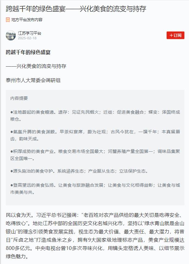 学习强国江苏学习平台推出《跨越千年的绿色盛宴——兴化美食的流变与持存》