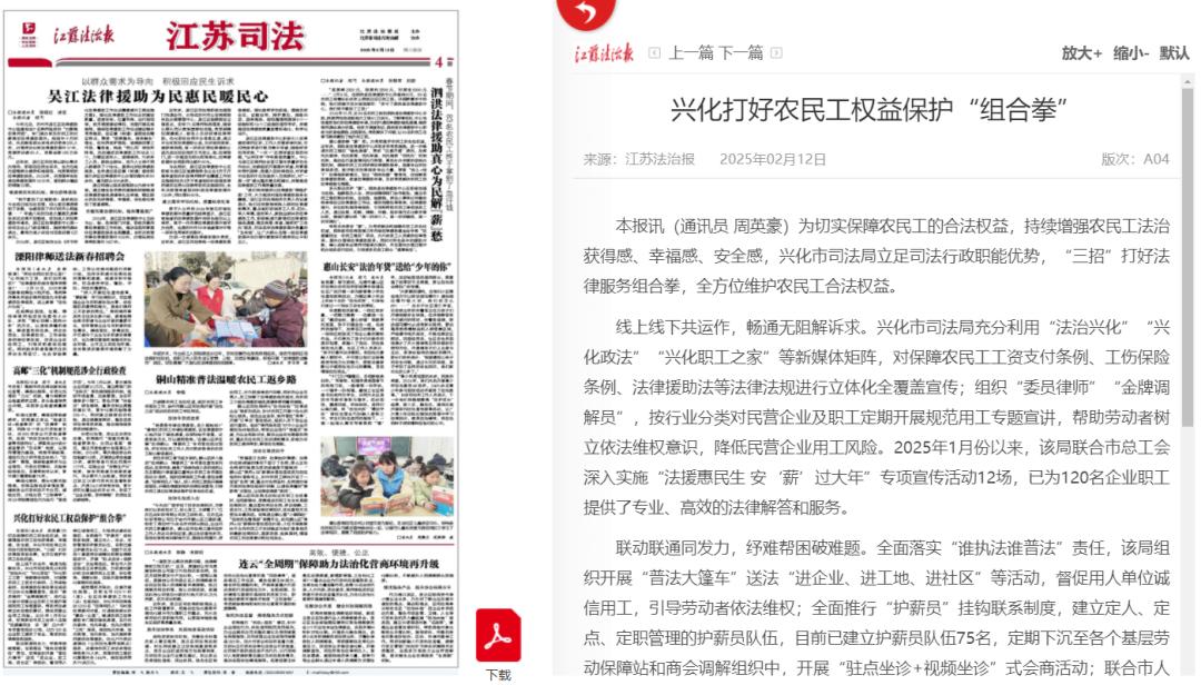 《江苏法治报》推出《兴化打好农民工权益保护“组合拳”》