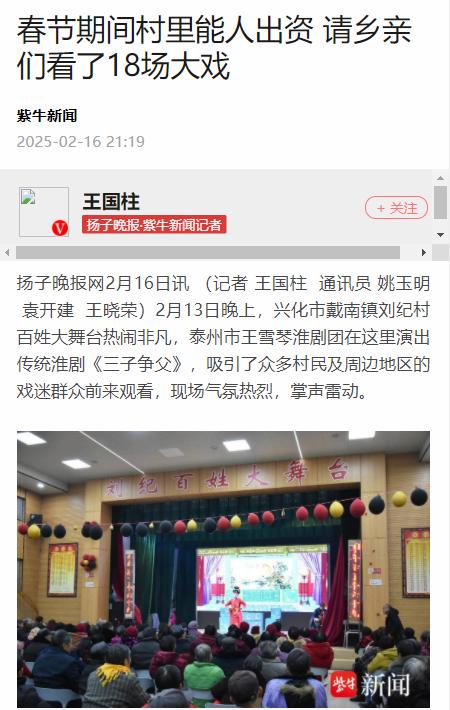 扬子晚报紫牛新闻推出《春节期间村里能人出资