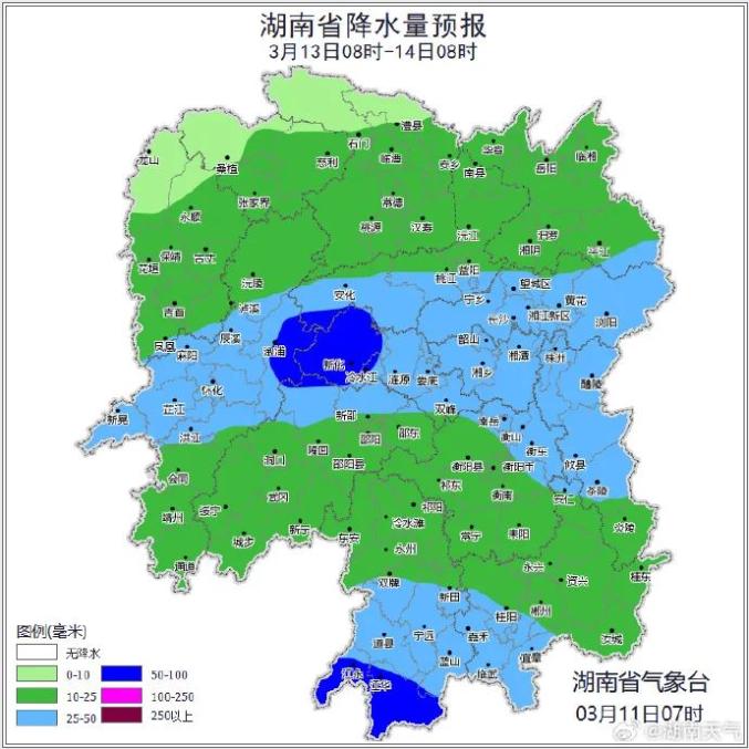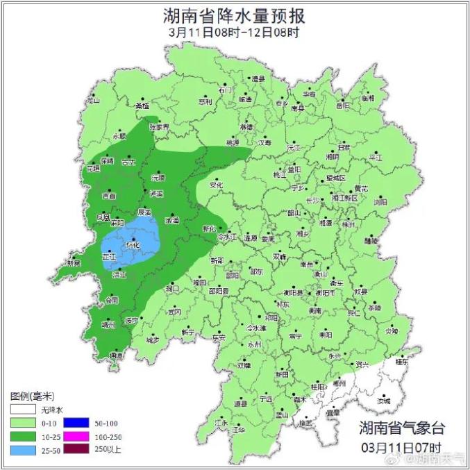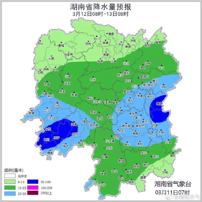 根据气象部门预报,今晚至15日白天有次降温、降雨过程,并伴有雷暴大风等强对流天气,过程累计雨量湘西州南部、怀化中部、永州南部局地110~140毫米,湘中偏北、湘南的其他地区50~80毫米。其中,11日湘西州中南部、怀化北部有暴雨;12日湘中、湘东南局地大到暴雨;13日湘中、湘南局地大雨;14日湘南局地暴雨。