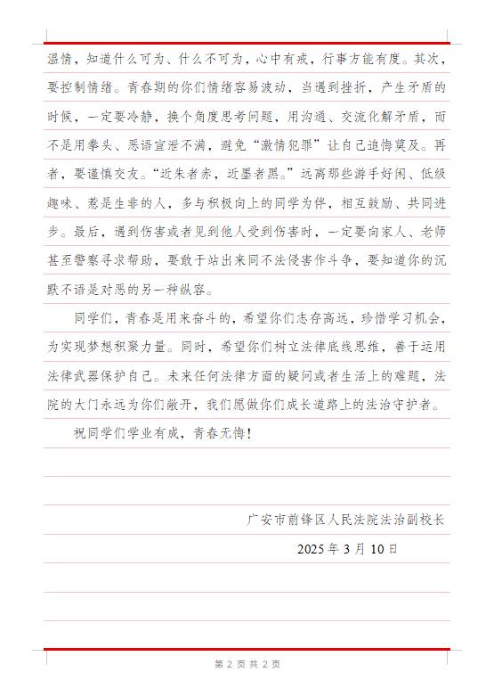 前锋区法院将继续发挥法治副校长的教育和引导作用,搭建“家校社协同共育”的桥梁,为平安校园法治校园建设和未成年人健康成长提供坚实保障。原标题:《法育青衿丨致亲爱的同学们》