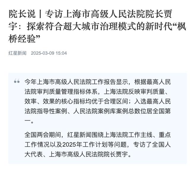 ▴ 点击图片查看详情 ▴原标题:《红星新闻 | 专访上海市高级人民法院院长贾宇:探索符合超大城市治理模式的新时代“枫桥经验”》