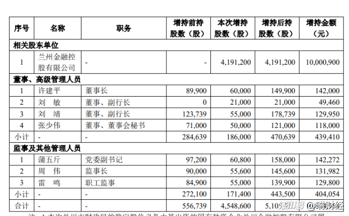 截至2025年2月底,兰州金控代兰州银行主要股东兰州市财政局以自有资金增持419万股,增持金额1000.09万元。而现任董事、高级管理人员已累计增持18.60万股,增持金额合计43.94万元,部分监事及其他管理人员已累计增持17.14万股,增持金额合计40.41万元。