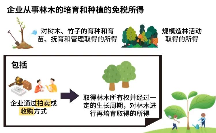 企业从事农、林、牧、渔业项目的所得,可以免征、减征企业所得税。企业从事林木培育和种植的所得,免征企业所得税企业从事林木的培育和种植的免税所得,是指企业对树木、竹子的育种和育苗、抚育和管理以及规模造林活动取得的所得,包括企业通过拍卖或收购方式取得林木所有权并经过一定的生长周期,对林木进行再培育取得的所得。