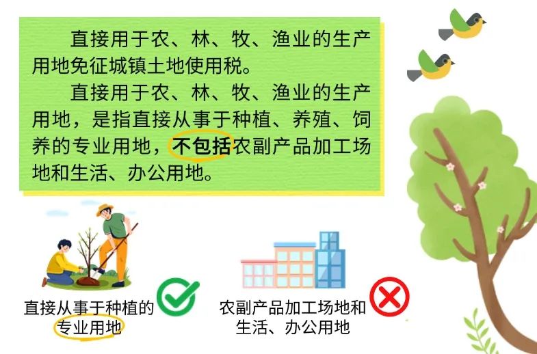 直接用于农、林、牧、渔业的生产用地免征城镇土地使用税。直接用于农、林、牧、渔业的生产用地,是指直接从事于种植、养殖、饲养的专业用地,不包括农副产品加工场地和生活、办公用地。