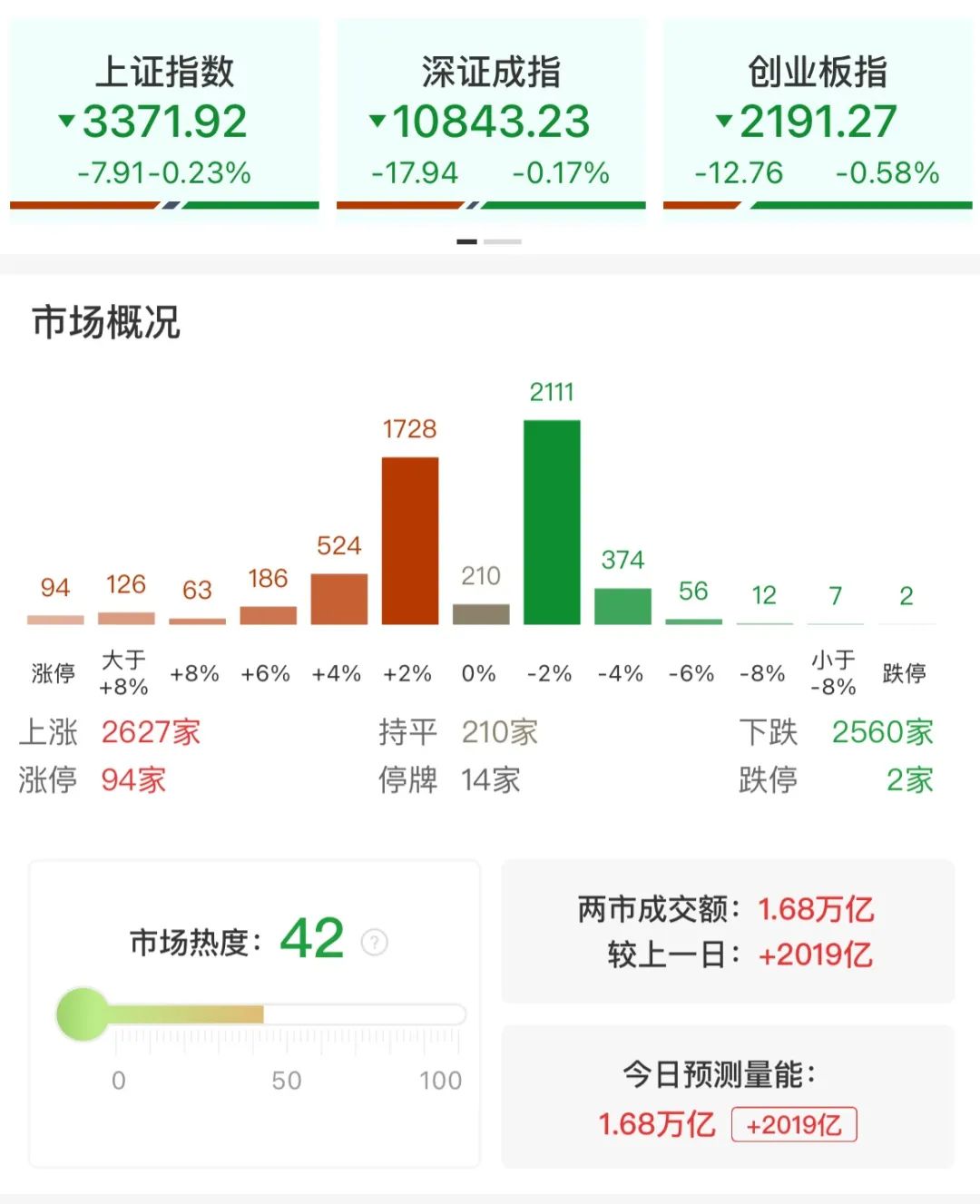 市场全天冲高回落,三大指数小幅下跌,沪指盘中一度创出年内新高。沪深两市全天成交额1.68万亿,较上个交易日放量2019亿。