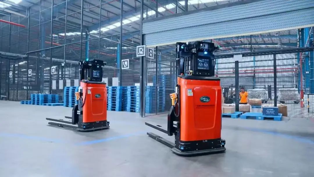 广州白云国际机场进港仓库无人叉车正在作业。