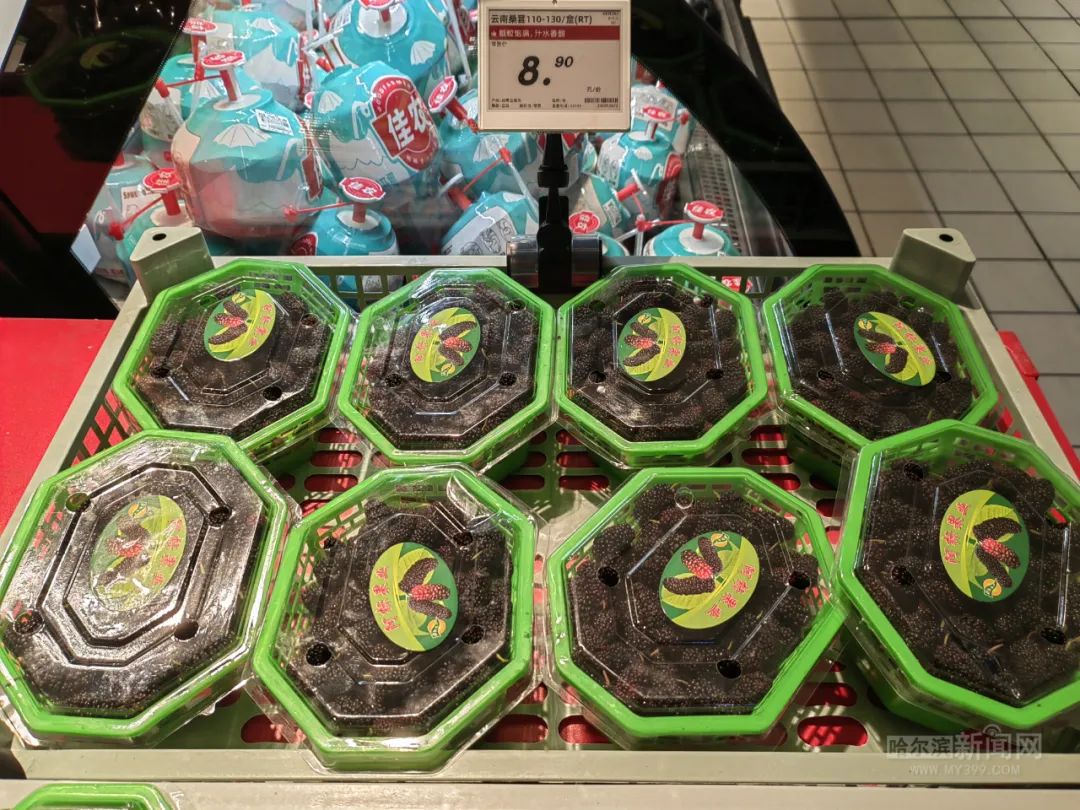 采访中记者了解到,桑葚在我国多地均有种植,包括云南、江苏、四川、辽宁等,可以说大江南北都能看到其身影,并不是稀缺的水果,每年春季是新鲜桑葚上市之时。由于南方气温更高,桑葚结果也更早,目前,哈埠销售的桑葚果基本都来自南方省份。预计到4月中旬左右,北方各地的桑葚就会陆续成熟进入市场,届时哈埠桑葚价格会明显下降。