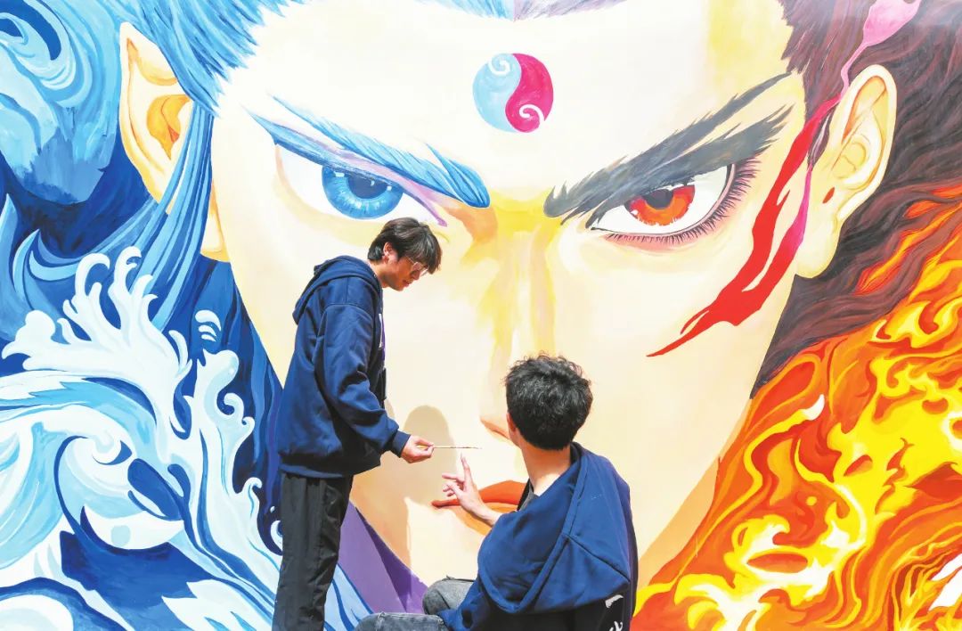 在坡博一横路,画师们对《哪吒之魔童闹海》主题墙绘进行精修。记者 康登淋 摄2
